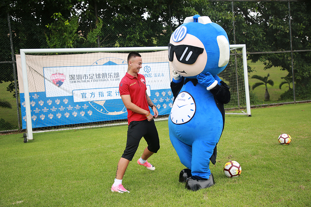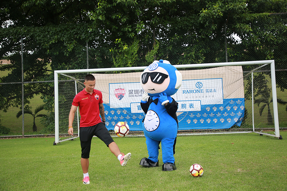 會后,雙方嘉賓移步至足球場觀看深足球員馳騁球場的颯爽風姿,一睹球員訓練風采。雷諾表品牌IP雷小諾也出現在球場,與球員們踢球互動。戲精雷小諾奔跑在球場上,三招兩式,踢球翻身現場就引來熱情圍觀。