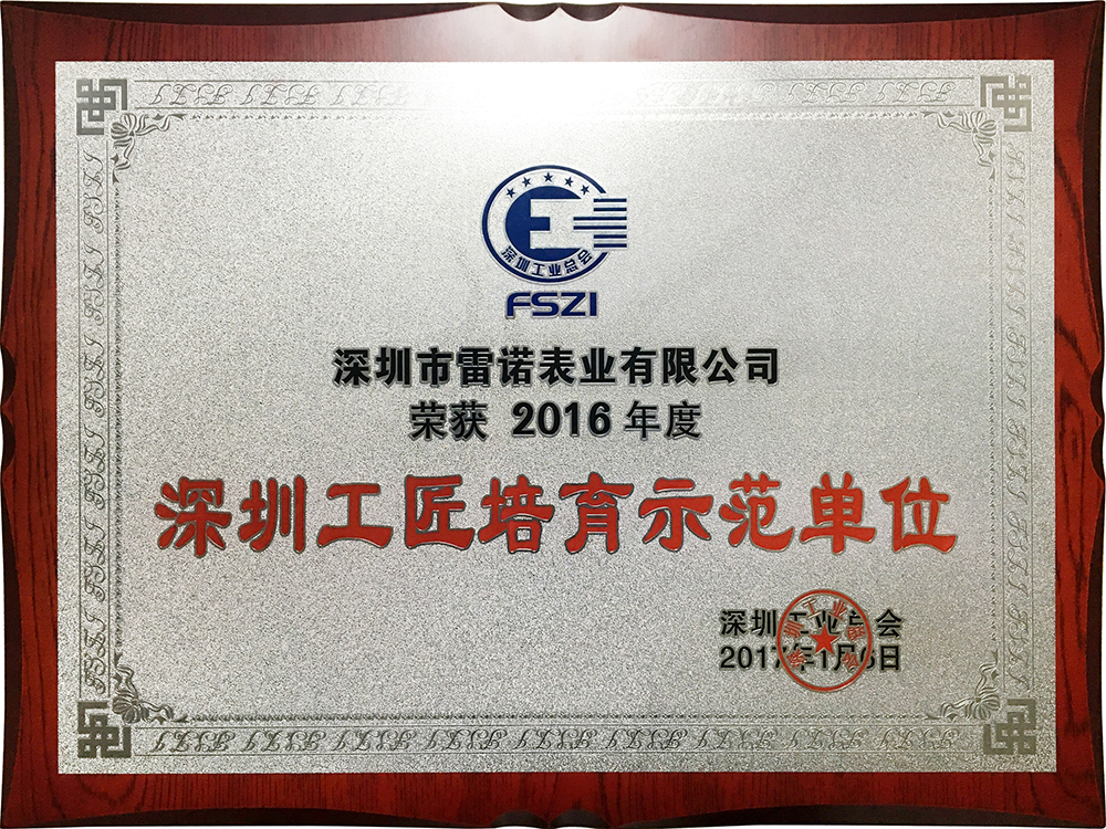 日前,深圳市雷諾表業有限公司在深圳市工業總會2016年度總會上榮獲:履行社會責任杰出企業、深圳工匠培育示范單位、自主創新標桿企業稱號,雷諾表業董事長詹西洲先生榮獲企業家卓越貢獻獎,雷諾表業兩位技師榮獲深圳百優工匠獎。