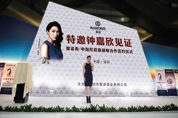 當天,鐘嘉欣現身雷諾“古典話筒”展館,引爆現場高潮氣氛,成為整個展覽的焦點,秒殺不少菲林。下午5時,鐘嘉欣佩戴雷諾贈送的手表,與雷諾表業董事長詹西洲、總經理詹江洲、《中國經營報》社長韓曦晨共同揭開“藝術之旅”系列新表款的神秘面紗,正式對外發布這一全新系列的新表款。